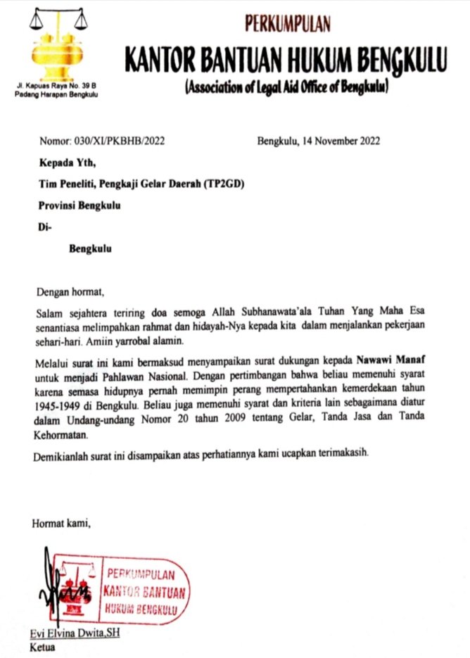 Hal ini termuat dalam Surat Resmi lembaga PKBHB Nomor : 030/XI/PKBHB/2022 Bertanggal 14 November 2022 yang ditujukan kepada Tim Peneliti, Pengkaji Gelar Daerah (TP2GD) Provinsi Bengkulu yang langsung bertanda tangan Ketua PKBHB Evi Elvina Dwita. SH. Sebagaimana yang diterima Awak Media, Selasa pagi (15/11/22) via pesan WhatsApp.