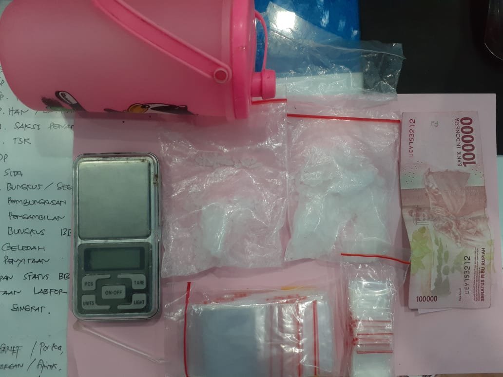 Selain barang bukti sabu, lanjut AKP Juriadi, Polisi juga mengamankan satu buah timbangan elektrik, satu plastik klip transparan ukuran kecil kosong, 1 ball plastik klip transparan ukuran besar kosong, satu buah pipet yg diruncingkan sebagai sekop dan uang Rp 200 ribu dan satu buah botol minuman warna pink.