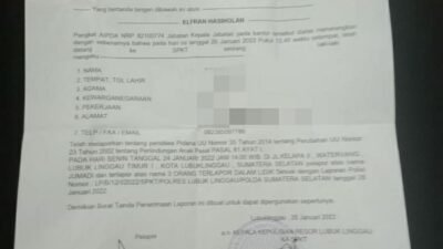 Lubuklinggau, Darah Juang Online – JD (41) warga Kota Lubuklinggau masih berharap laporannya di Polres Lubuklinggau 26 Januari 2022 yang lalu, dapat segera mengungkap dugaan tindak pidana yang menimpa anaknya AG (15) yang masih duduk dibangku SMA kelas 1, sesuai dengan Undang-undang Nomor 35 Tahun 2014 tentang perubahan Undang-undang Nomor 23 Tahun 2002 tentang perlindungan anak Pasal 81 Ayat 1.