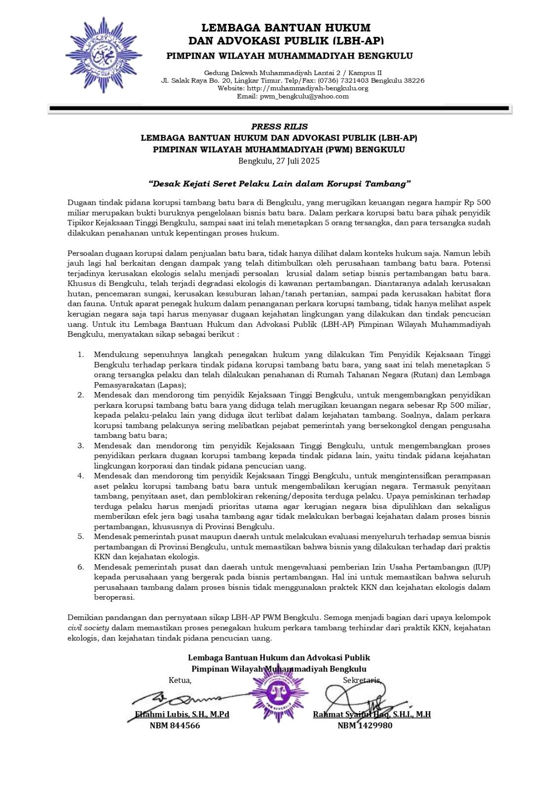 Demikian surat pernyataan sikap LBH-A P PWM Bengkulu, semoga menjadi bagian dari upaya kelompok civil society dalam memastikan proses penegakan hukum perkara tambang terhindar dari praktik KKN, kejahatan ekologis, dan kejahatan tindak pidana pencucian uang, sebagaimana termuat dalam rilis yang diterima Awak Media DJO. Minggu (27/7/25). (Red/01)