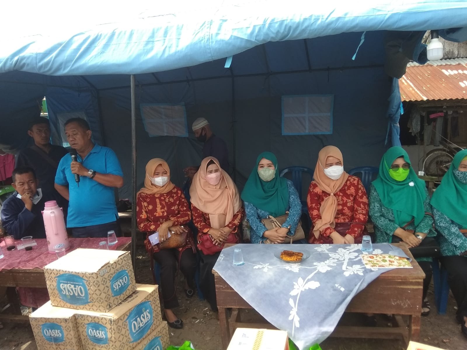 Ketua PKK Se-Kecamatan Kertapati Ibu Rismawana, Am. kep, didampingi Wakil Dr. Jean Andini dan Anggota Ibu PKK menyerahkan langsung bantuan berupa Beras, Gula, Gandum, Miee Instan, serta air mineral kepada korban kebakaran.