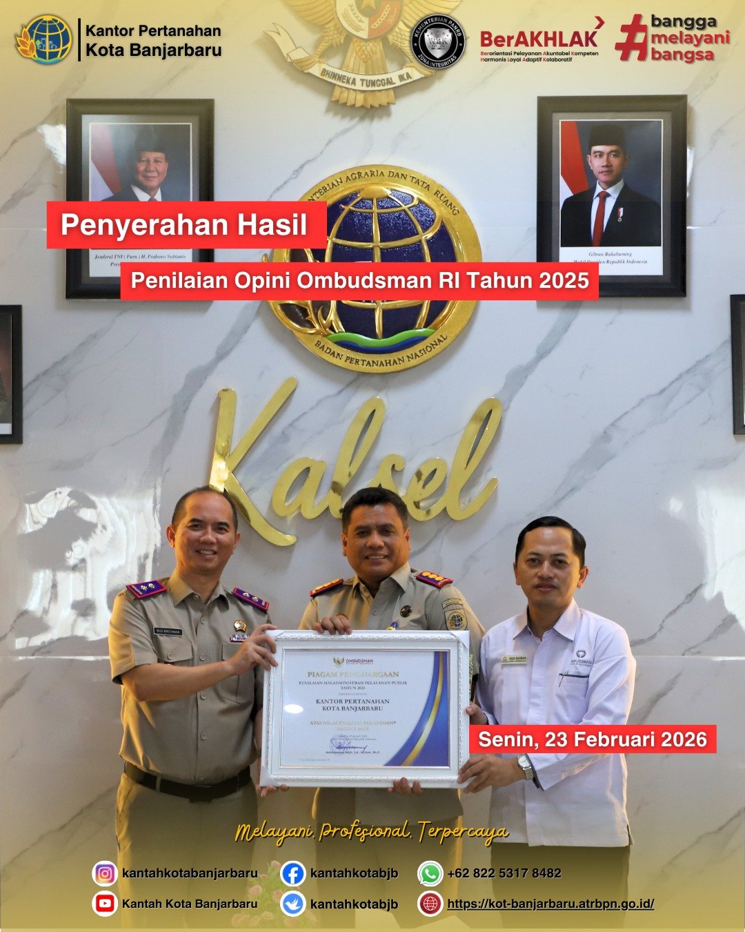 Pelayanan Prima Berbuah Prestasi, ATR/BPN Banjarbaru Raih Nilai 93,47 Sabet penghargaan dari Ombudsman